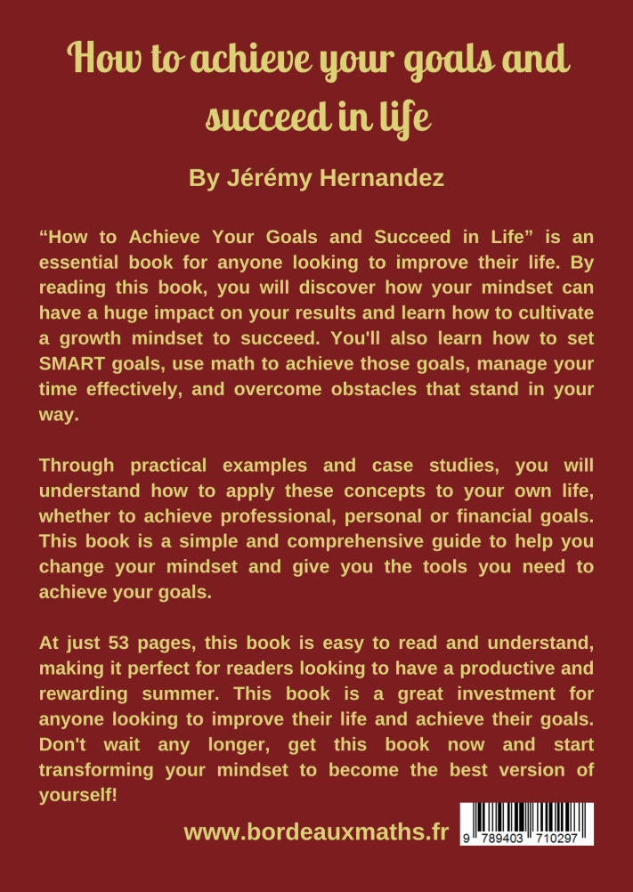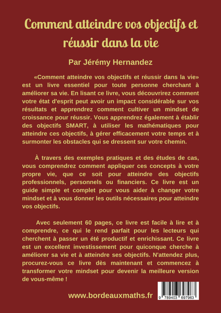 «Comment atteindre vos objectifs et réussir dans la vie» est un livre essentiel pour toute personne cherchant à améliorer sa vie. En lisant ce livre, vous découvrirez comment votre état d’esprit peut avoir un impact considérable sur vos résultats et apprendrez comment cultiver un mindset de croissance pour réussir. Vous apprendrez également à établir des objectifs SMART, à utiliser les mathématiques pour atteindre ces objectifs, à gérer efficacement votre temps et à surmonter les obstacles qui se dressent sur votre chemin.